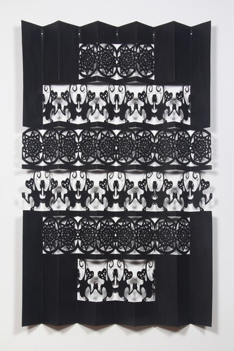 Lonnie Hutchinson’s artworks are intricately patterned and delicate; at first glance they recall the time-consuming sewing, crochet, knitting, and quilting that saw female hands kept busy with (unpaid) “women’s ...